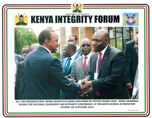 The APSEA Chairman welcomes His Excellency The President Hon. Uhuru M. Kenyatta during the during the National leadership and Integrity Conference at the Kenya School of Monetary Studies.